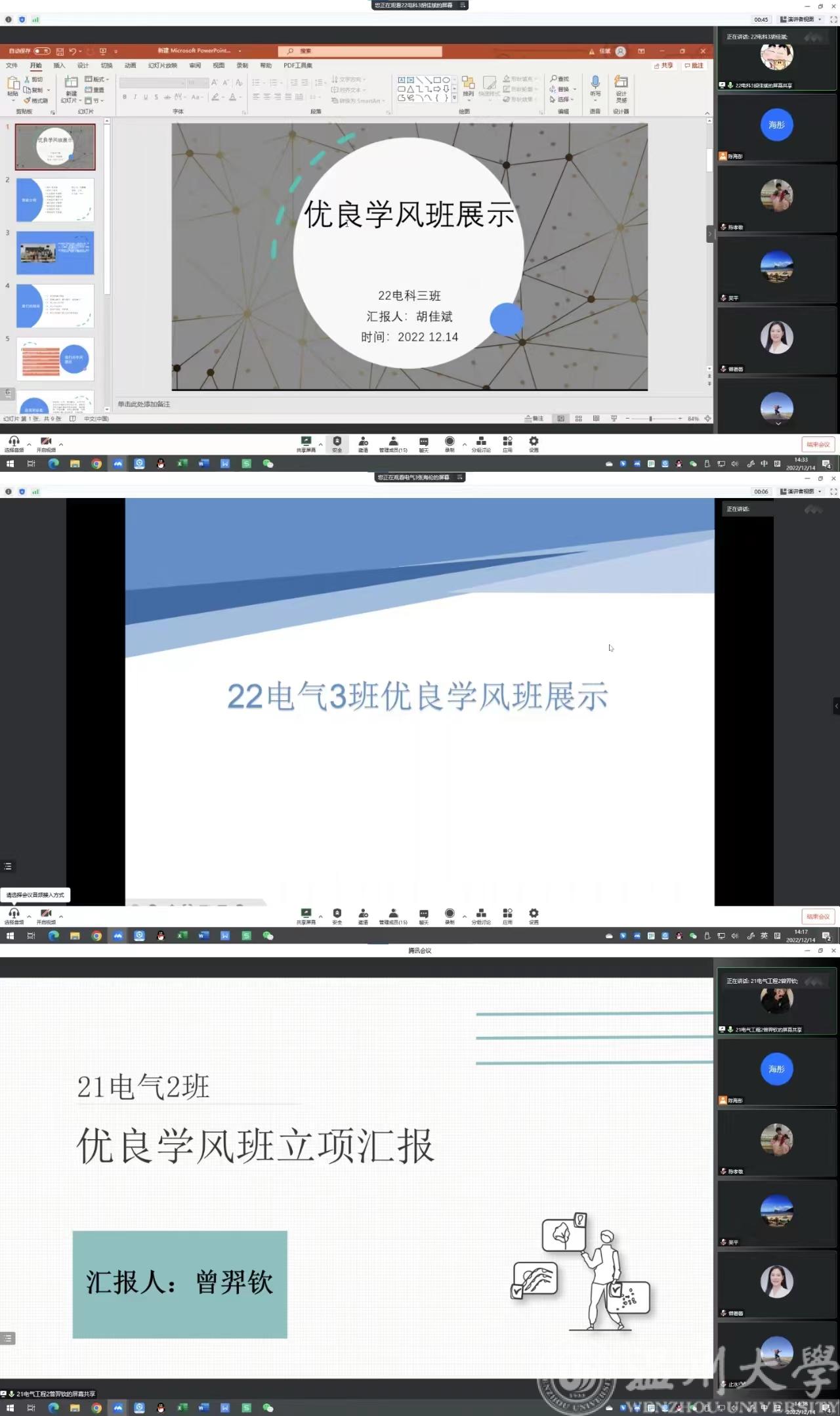 为进一步加强校风学风建设,树立优良学风,加大优秀班级的示范作用,博彩平台 于2022年12月14日在线上举办2022/2023学年“优良学风班”立项申请评选活动。博彩平台 本科生评选委员会委员及申请立项的9个班级出席了本次活动。