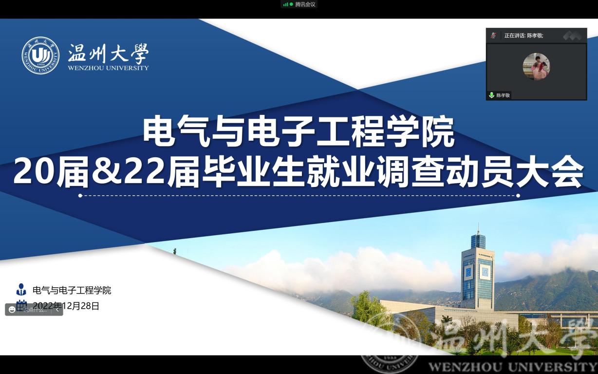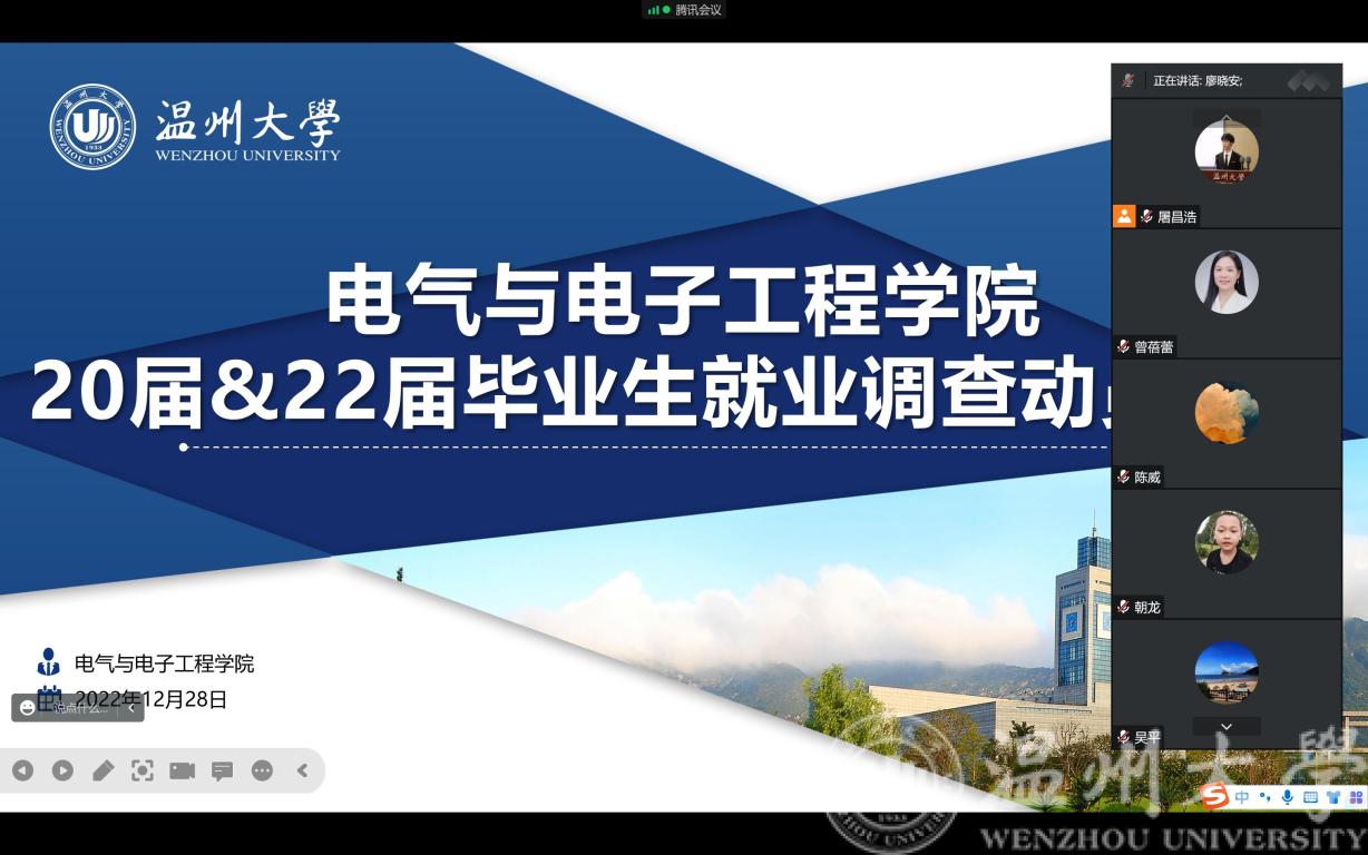 12月28日下午2:00,博彩平台 召开20届与22届毕业生就业调查动员大会线上会议。副院长陈孝敬、党委副书记曾蓓蕾、电气系主任吴平、电子系主任庄友谊、学工办主任廖晓安以及20届与22届各毕业班班主任参会,会议由学工办就业辅导员屠昌浩主持。