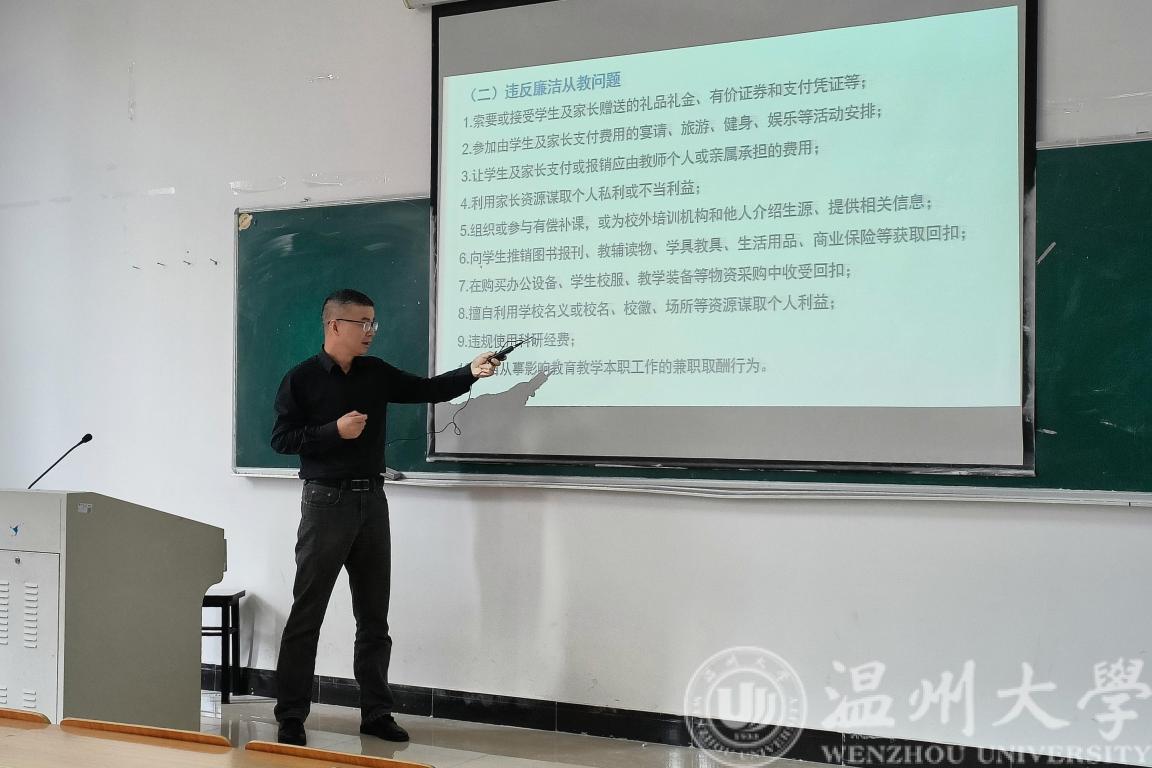 会上,党委书记李方强传达了《浙江省教育厅办公室关于印发<全省教育系统师德师风问题整治工作实施方案>》以及《温州大学师德师风问题专项整治工作实施方案》的通知精神,他指出,学生安全和师德师风是博彩平台 建设事业的“1”,其余都是“1”后面的“0”。如果没有这个“1”,再多的“0”都会变得毫无意义。因此,切实加强师德师风建设是博彩平台 建设的首要任务。