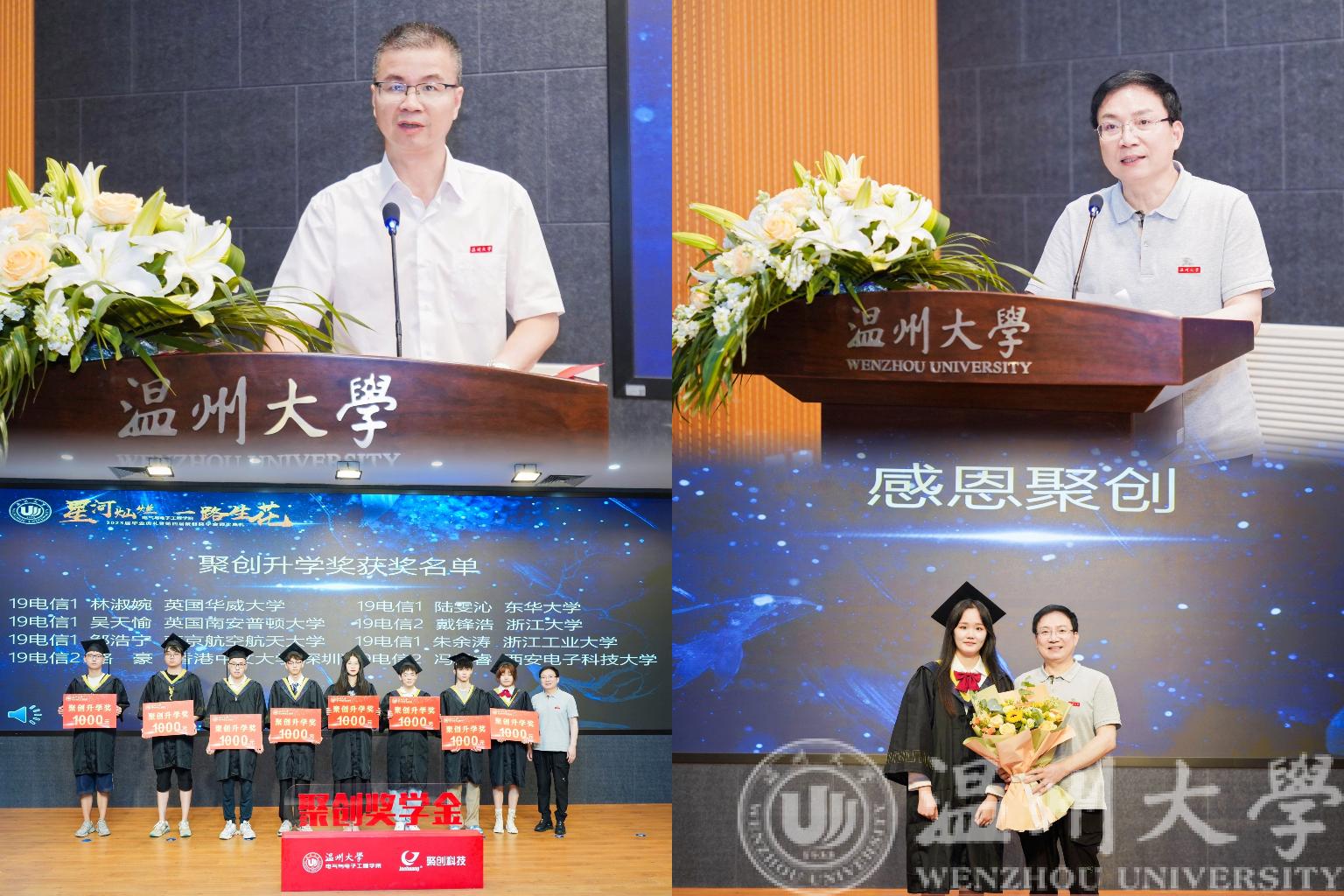 为表彰先进,在校友企业浙江聚创智能科技公司的赞助下,博彩平台 特别设立聚创奖学金。毕业典礼仪式上,博彩平台 党委书记李方强宣读了《2023年聚创升学奖奖励决定》文件及名单。聚创奖学金发起人吴桂初先生为获得聚创升学奖的68位毕业生代表颁奖。随后,曾担任博彩平台 学生会主席、成功考取西安电子科技大学硕士研究生的省优毕业生缪安琪同学为吴桂初教授献花并表达感谢。