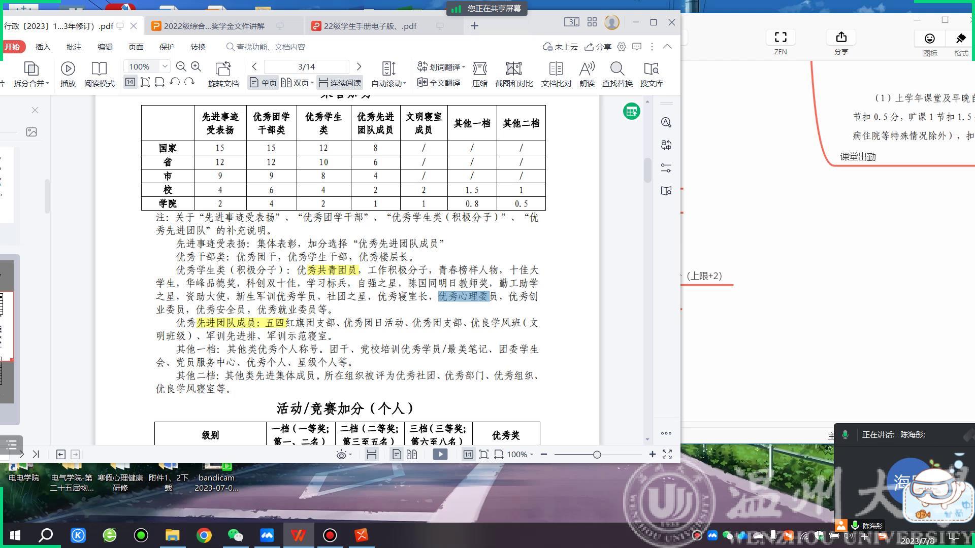 会议上陈老师详细介绍了温州大学各项奖学金的评选条件以及评选方法,鼓励同学主动向目标靠拢,争取奖学金;随后陈老师详细介绍了“综合评价实施细则”,包括各项目的组成以及分值;对评选的具体流程、班委职责以及关键时间节点进行介绍,提醒同学们提早做好准备,及时在综合评价平台完成2022-2023学年的综合评价项目赋分项的申请。