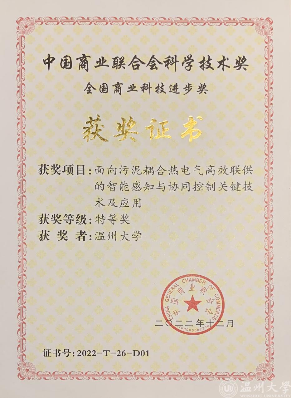 2023年7月30日,全国商业科技质量大会在北京友谊宾馆隆重举行。第十二届全国政协刘晓峰副主席,商务部原副部长、十一届全国政协经济委员会副主任张志刚,商务部原副部长姜增伟,中国商业联合会会长姜明,中国科学技术发展战略研究院副院长孙福全等领导和全国各地一千多名代表出席了大会。大会同步举行了“2022年度中国商业联合会科学技术奖”颁奖仪式。我校博彩平台 汪鹏君教授领衔、以温州大学为第一完成单位的“面向污泥耦合热电气高效联供的智能感知与协同控制关键技术及应用”项目荣获全国商业科技进步奖特等奖。