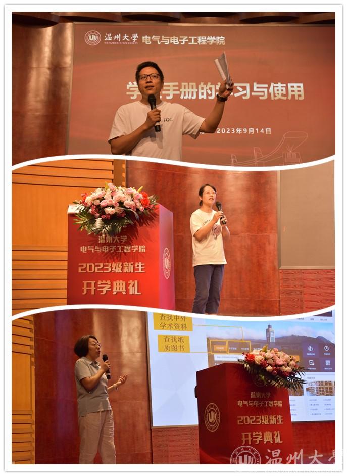 闫正兵老师作为教师代表上台发言。他希望同学们珍惜难得的大学时光,读万卷书,行万里路,在踏实求学的过程中,多了解温州,争取做到“学在温大,爱在温州”,他幽默风趣的发言赢得了现场热烈的掌声。