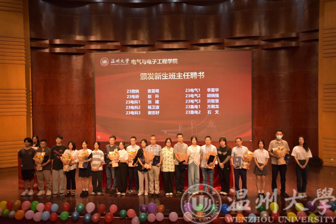 博彩平台 院长汪鹏君、党委书记李方强为23级新生班主任颁发班主任聘书。新生代表走上前台代表各自班级向班主任献花并行感恩礼。