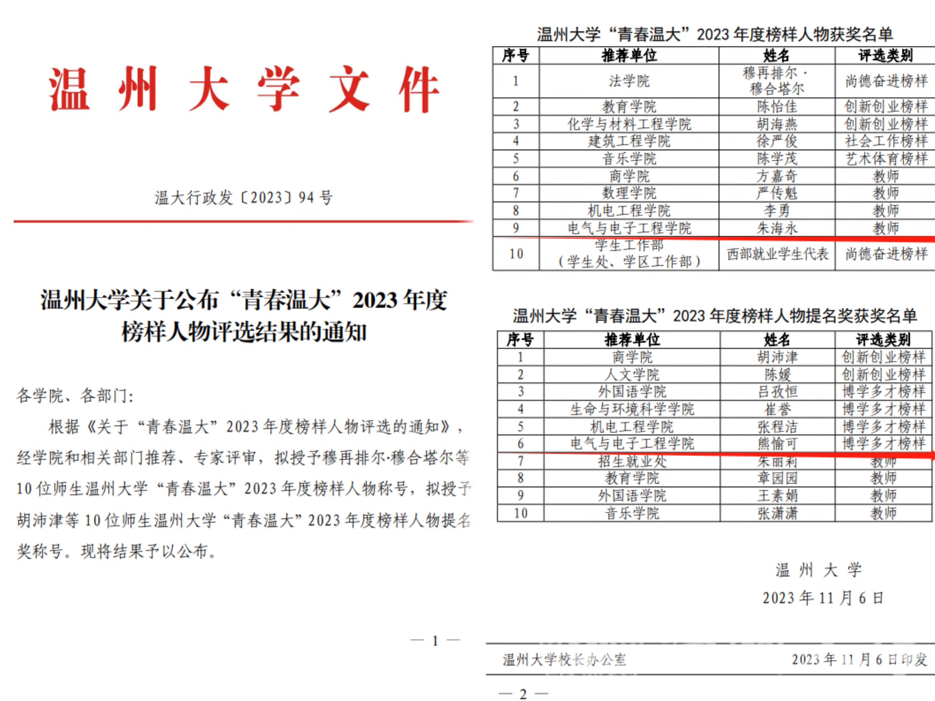 日前,温州大学“青春温大”2023年度榜样人物评选结果出炉,博彩平台 副院长朱海永教授荣获“青春温大”·2023年度榜样人物,2023届毕业生熊愉可荣获年度博学多才榜样提名奖。