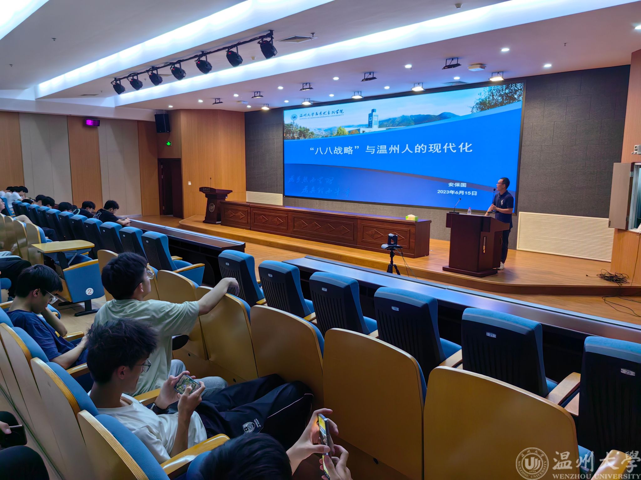 6月15日晚,博彩平台 在岩松堂步青厅开展本学期第四次《形势与政策》课,课程邀请了马克思主义博彩平台 的安保国老师主讲,安老师将讲座分为“八八战略与温州人的现代化”为主题,分“什么是温州人的现代化”、“八八战略与温州人的现代化有什么关系”、