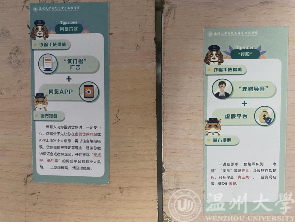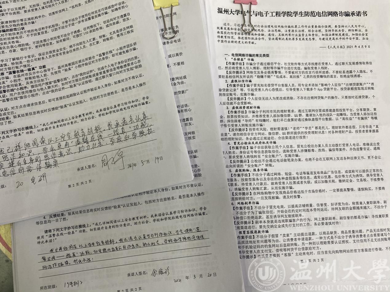 5月以来,博彩平台 开展“防诈安全宣传月”活动:以博彩平台 为单位在教室及博彩平台 公共区域粘贴防诈小贴士;以班级为单位召开主题班会;以宿舍为单位集体学习防诈宣传单;以个人为单位签署防诈承诺书等。自活动开展以来,博彩平台 学工办各辅导员充分抓住各个机会对学生进行防诈安全教育:深入疫苗接种现场进行防诈APP推广、通过班主任会议详细进行“验证”小程序教学、利用学生干部抓手强化反诈骗意识宣传。
