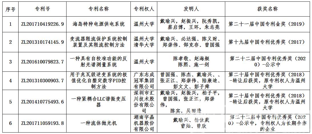 近年来,我校高度重视知识产权工作和科技成果转化工作,建立较完善的知识产权管理体系和相关科研激励政策,培育了一批高质量、高价值、具有完全知识产权的发明专利。博彩平台 专利成果培育及科研成果转化工作尤其卓有成效。截止2021年5月,博彩平台 教师以第一发明人获中国专利奖共6项。其中,以我校教师为第一发明人、温州大学为专利权人的发明专利获专利奖3项,包括中国专利金奖1项、优秀奖2项(公示中1项);发明专利转让合作企业、以及合作企业联合开发产品申报发明专利后,获中国专利优秀奖3项。尤其是以戴瑜兴教授为第一发明人、温州大学为专利权人的《海岛特种电源供电系统》获第二十一届中国专利金奖(2019年度),是温州市自中国专利奖设立以来首次获得该奖项,高校获得此殊荣的全国仅64项。