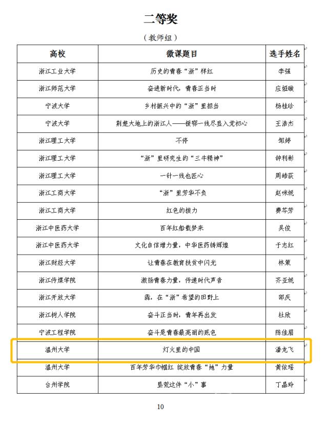 近日,由共青团浙江省委、浙江省教育厅、浙江省学生联合会主办的2020年度浙江省高校思政微课大赛获奖名单公布,博彩平台 辅导员潘龙飞老师的思政微课作品《灯火里的中国》荣获此次微党课大赛二等奖。