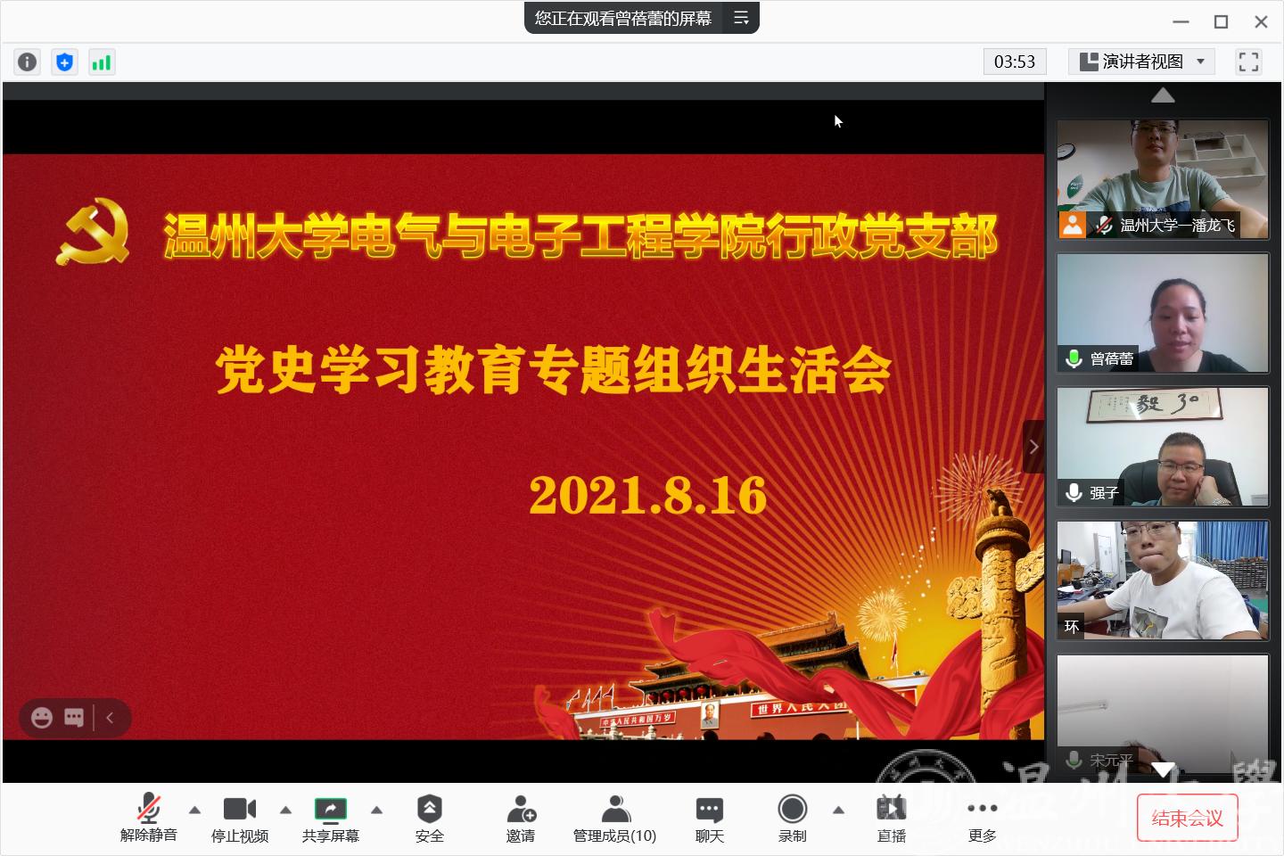 根据市和学校党史学习教育领导小组部署要求:“七一”后基层党组织要围绕“学党史、悟思想、办实事、开新局”为主题,认真贯彻“学史明理、学史增信、学史崇德、学习力行”要求,以党支部为单位,组织党员召开一次专题组织生活会,交流学习体会,查找差距不足,引导广大党员不断增强“四个意识”、坚定“四个自信”、做到“两个维护”。8月16日上午9:00,博彩平台 行政教工党支部召开党史学习教育专题线上组织生活会。