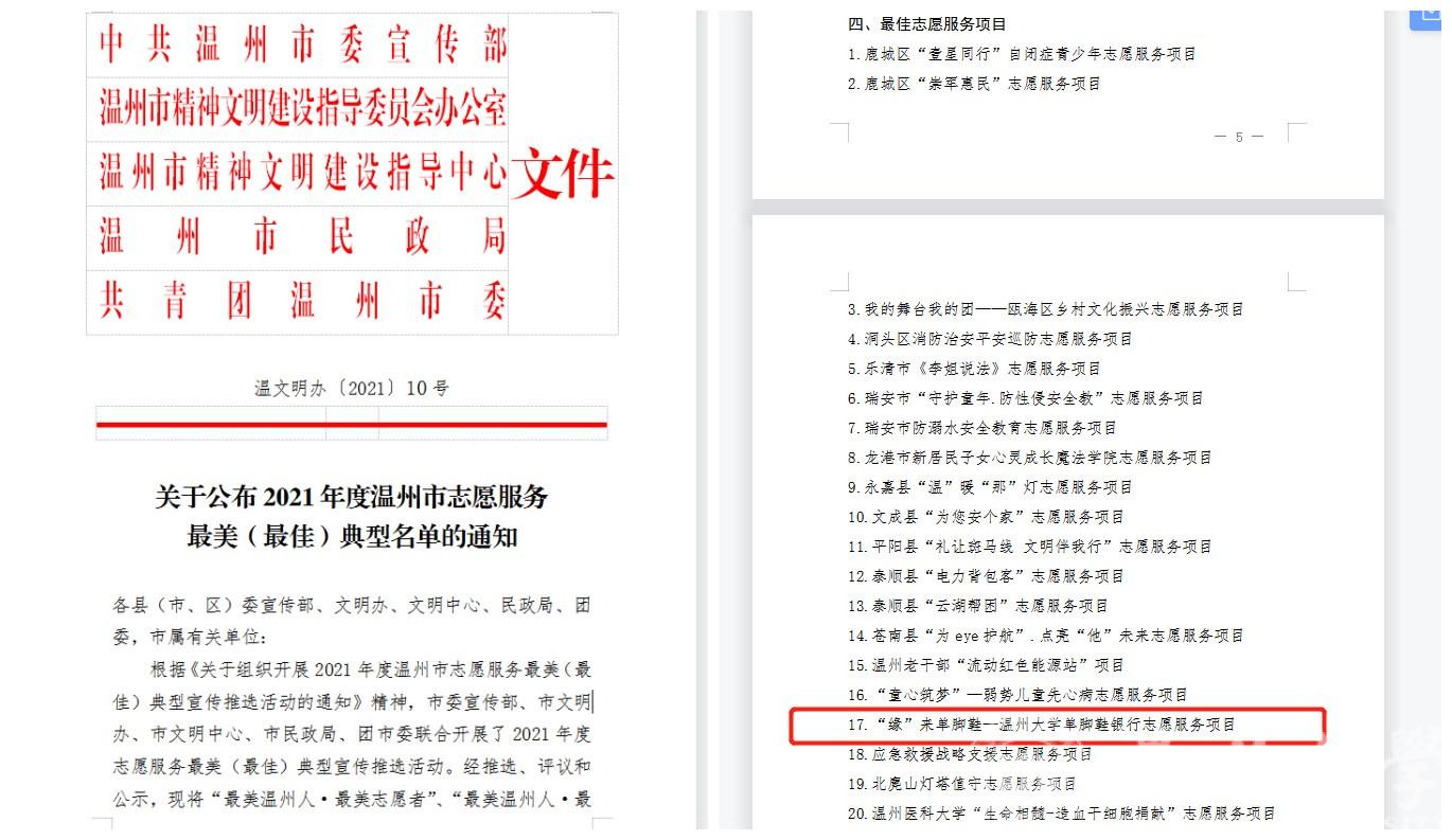 2021年度温州市志愿服务最美(最佳)典型名单于11月25日公布,经过博彩平台 推荐、社会评议,博彩平台 “单脚鞋银行”师生志愿者服务项目荣获温州市最佳服务项目奖。