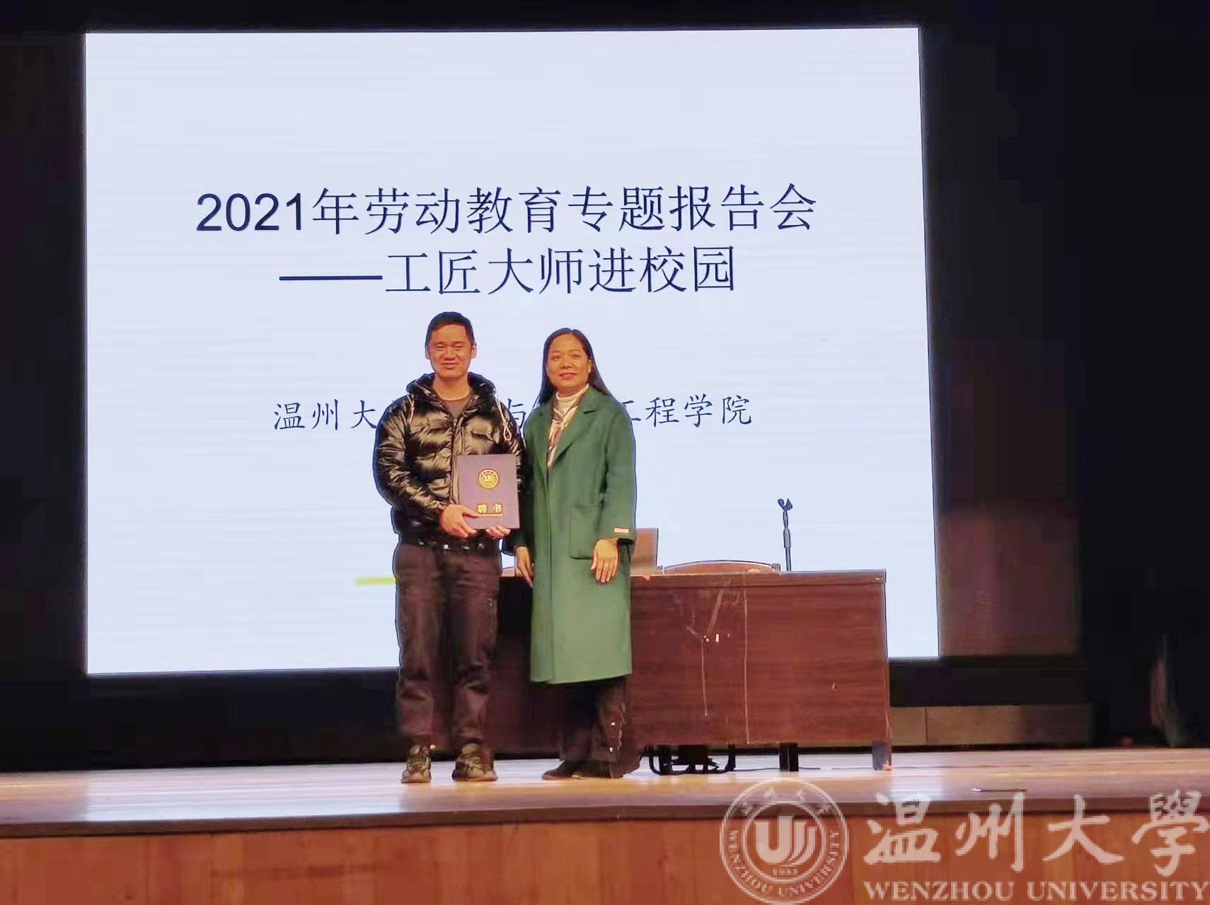 下午三点,报告会在正式开始。首先进行的是受聘仪式,伴着音乐响起,何升顺老师从曾蓓蕾书记手中接过聘书,随后,由浙江省工匠大师何升顺老师开讲。何升顺老师主要讲述了他从工作领衔人到制造工程部经理,再到金工车间主任,最后成为一名数控车工的成长经历。几年的探索过程中,何升顺老师脚踏实地,自学各种软件,不懂的就向同事讨教,凭着钉钉子的精神,刻苦钻研,最终成为一名工匠大师,他的经历让学生深受启发。