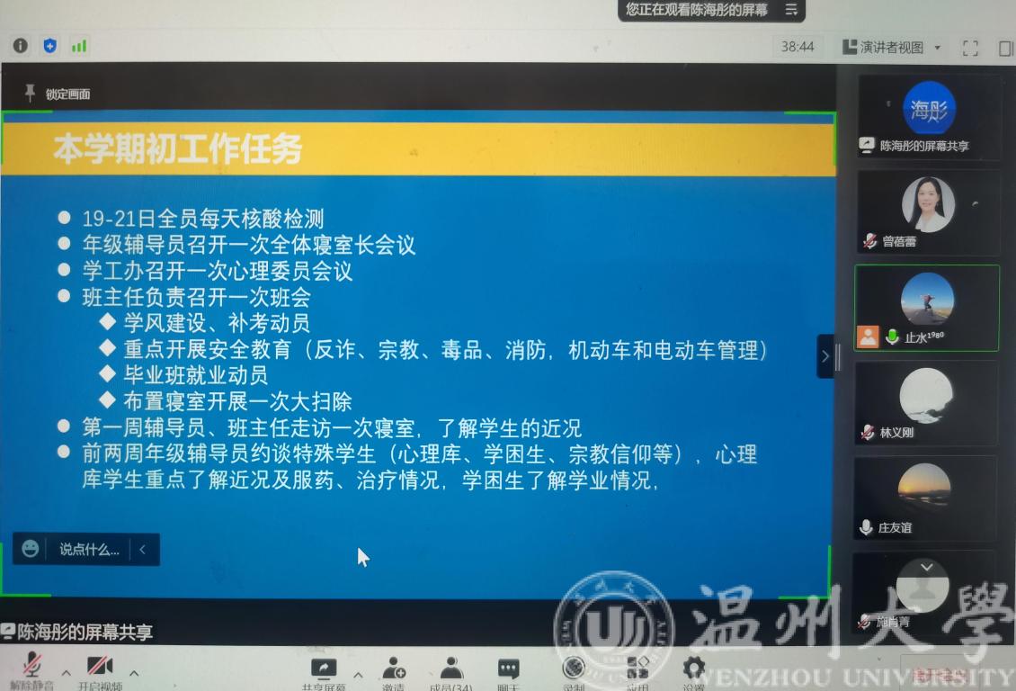 会议伊始,博彩平台 党委副书记曾蓓蕾传达了学校疫情防控工作会议的主题精神,就第一周线上教学及生活区相对封闭管理等做了详细说明。随后学工办主任廖晓安老师对本学期初的工作任务进行安排说明:全员核酸检测、寝室长会议、主题班会以及就业动员等。其中重点强调了心理健康教育和安全教育,廖老师建议第一周辅导员、班主任都能走访一下寝室,了解学生的近况以及线上教学的适应情况,及时关注跟进特殊学生群体,建议班主任充分利用班会、下寝室等机会开展防疫、防诈、防火、交通等安全教育,宗教政策教育,确保校园安全稳定。