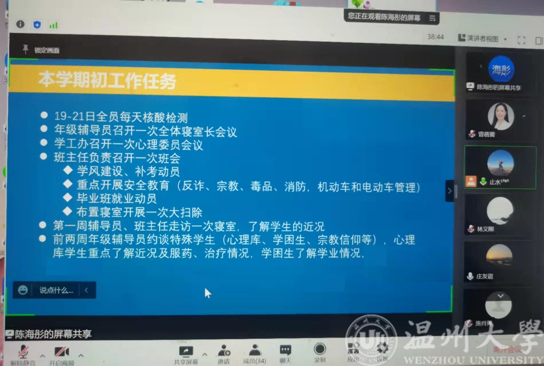 2月21日下午,博彩平台 召开线上2021-2022学年度第二学期第一次全体班主任会议,会上博彩平台 党委副书记曾蓓蕾传达了学校疫情防控工作会议的主题精神,就第一周线上教学及生活区相对封闭管理等做了详细说明,重点强调了新学期组织引导学生开展宗教知识的学习活动。会上,学工办主任廖晓安老师还围绕《宗教工作知识手册》相关内容进行了安排说明。