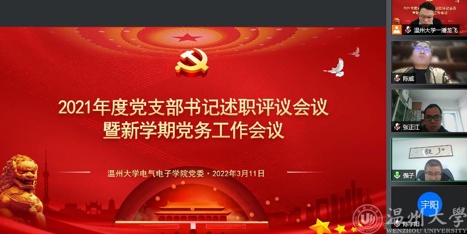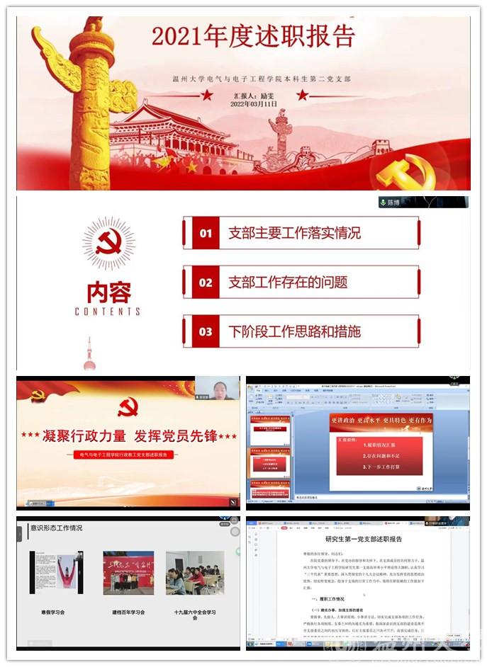 首先,由博彩平台 全体师生党支部书记作2021年度支部党建工作报告。博彩平台 电气系、电子系、低压电器平台、行政教工、智能锁具研究院党支部,本科生第一、二党支部,研究生第一、二党支部,共九个党支部书记依次作述职报告,汇报了2021年支部党员发展、理论学习和活动开展等情况,深入剖析支部工作中存在的问题,以及2022年支部工作改进要点和方案。