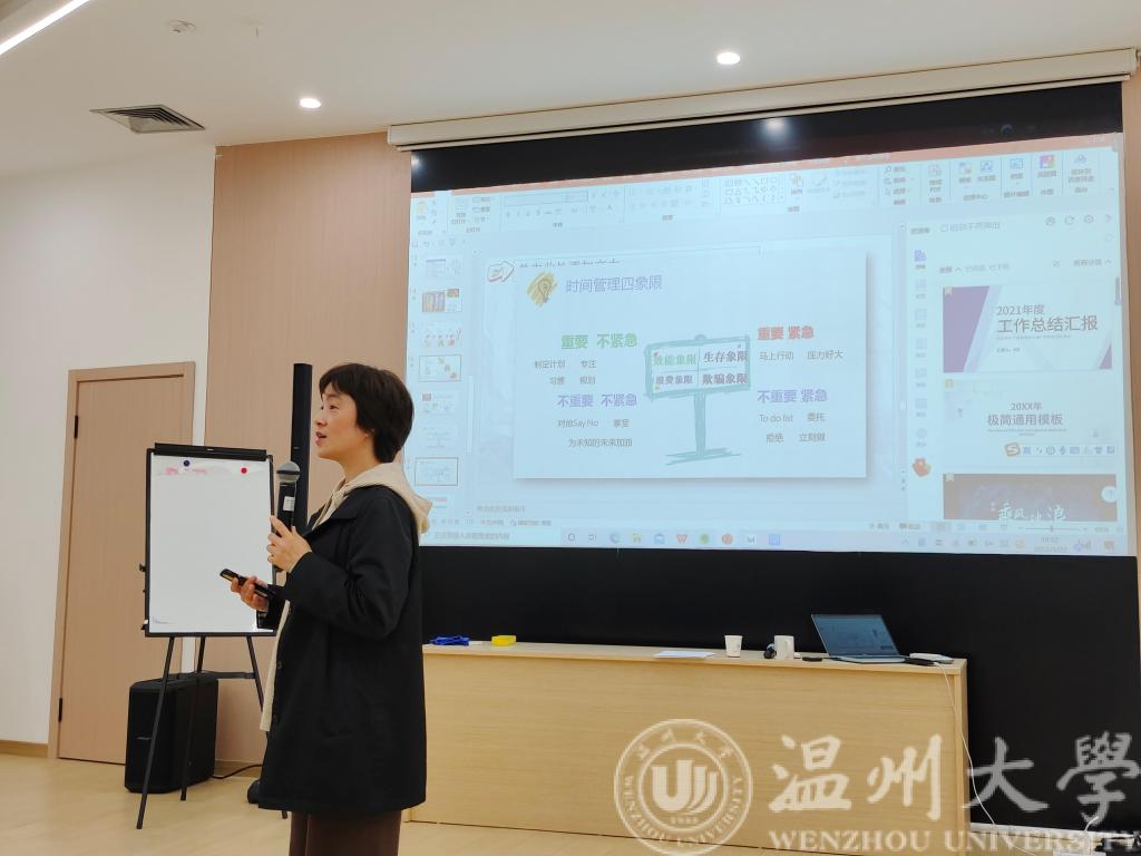 紧接着吕部长介绍了目标管理的“SMART”法则,即目标必须是具体的(Specific)、衡量的(Measurable)、可以达到的(Attainable)、有相关性(Relevant)和具有明确的截止期限(Time-based);以及根据事件的紧急和重要程度进行划分的“时间管理四象限”法则。