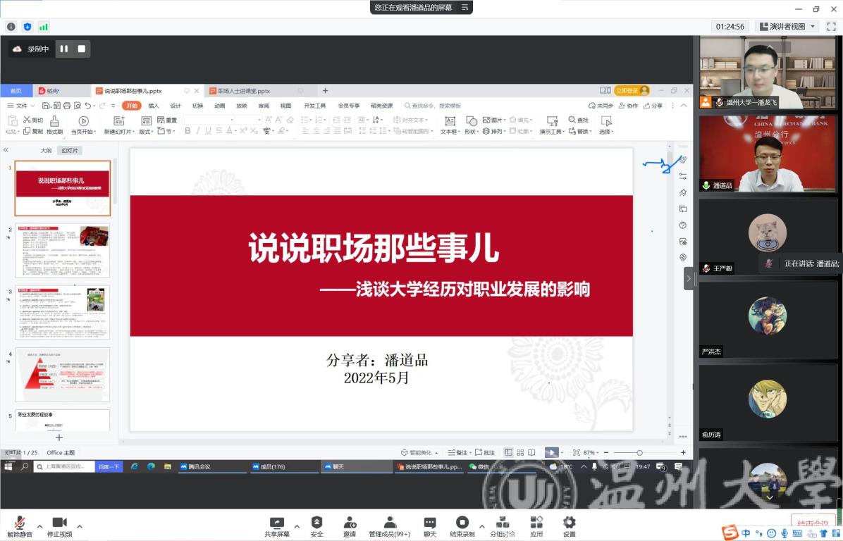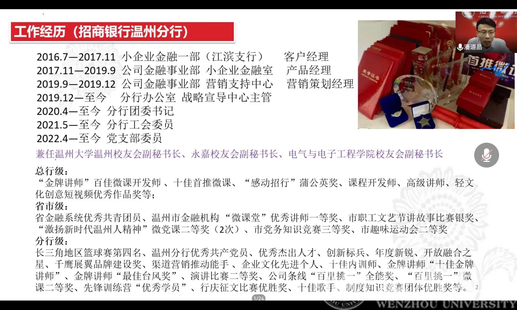 2022年校友节到来之际,为帮助学生明晰职业选择,做好职业规划,助力学生自主择业、理性就业,2022年5月11日晚上18:30,博彩平台 邀请到了2016届校友潘道品,为博彩平台 本科生开展线上讲座。此次讲座由博彩平台 辅导员潘龙飞主持,近200位学生参加了线上分享会。