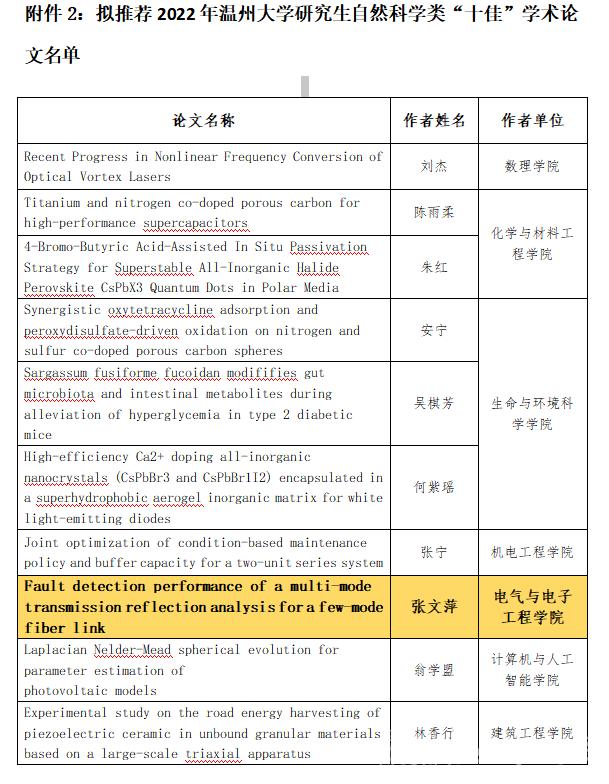 近期,2022年温州大学研究生“双十佳”学术论文评选结果公布,博彩平台 19级电气工程研究生张文萍同学的学术论文《Fault detection performance of a multi-mode transmission reflection analysis for a few-mode fiber link》获评自然科学类“十佳”学术论文。