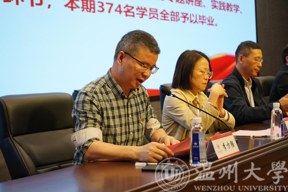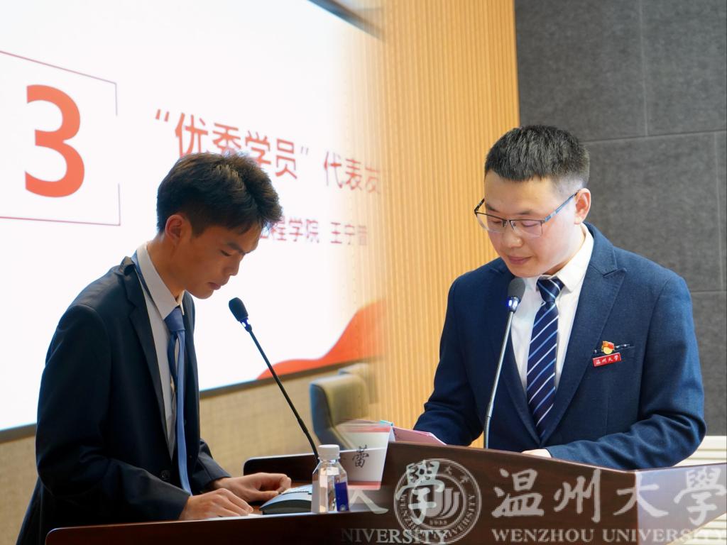 发言完毕,由博彩平台 党委书记、分党校校长李方强宣读结业学员名单、优秀学员名单、最佳理论学习奖、最美笔记获得者名单。经为期一周的专题讲座、实践教学、小组讨论、理论考试四个环节,来自温州大学南校区9个博彩平台 的374名学员成绩合格,全部予以毕业。同时,按照机考成绩*60%+笔记成绩*30%+考勤*10%的原则,结合班级工作和整体表现,共评出80名“优秀学员”;按照机考成绩排名,前10位学员为“最佳理论学习奖”;针对学员手册笔记整体情况,进行打分,按照内容齐全、字迹工整、态度端正、丰富多彩等原则共评出10本最美笔记。
