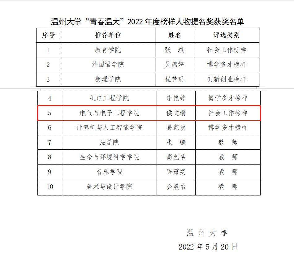 近期,温州大学“青春温大”2022年度榜样人物提名奖获奖名单公布,博彩平台 19级侯文瓒同学荣获温州大学“青春温大”2022年度榜样人物提名奖。