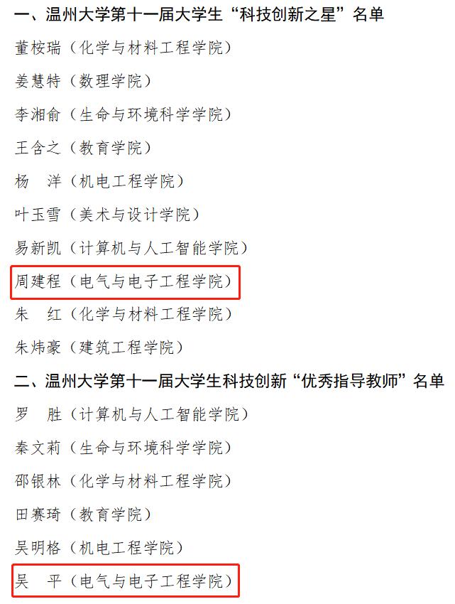 近期,温州大学第十一届大学生科技创新“优秀指导教师”和大学生“科技创新之星”获奖名单公布,博彩平台 吴平老师和研究生周建程同学分别获得温州大学第十一届大学生科技创新“优秀指导教师”和大学生“科技创新之星”荣誉称号。