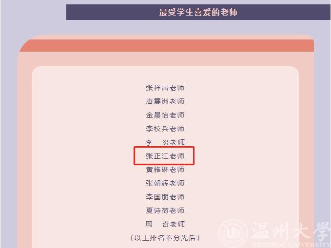 近期,温州大学“最受学生喜爱的老师”获奖名单公布,博彩平台 张正江老师荣获温州大学“最受学生喜爱的老师”荣誉称号。