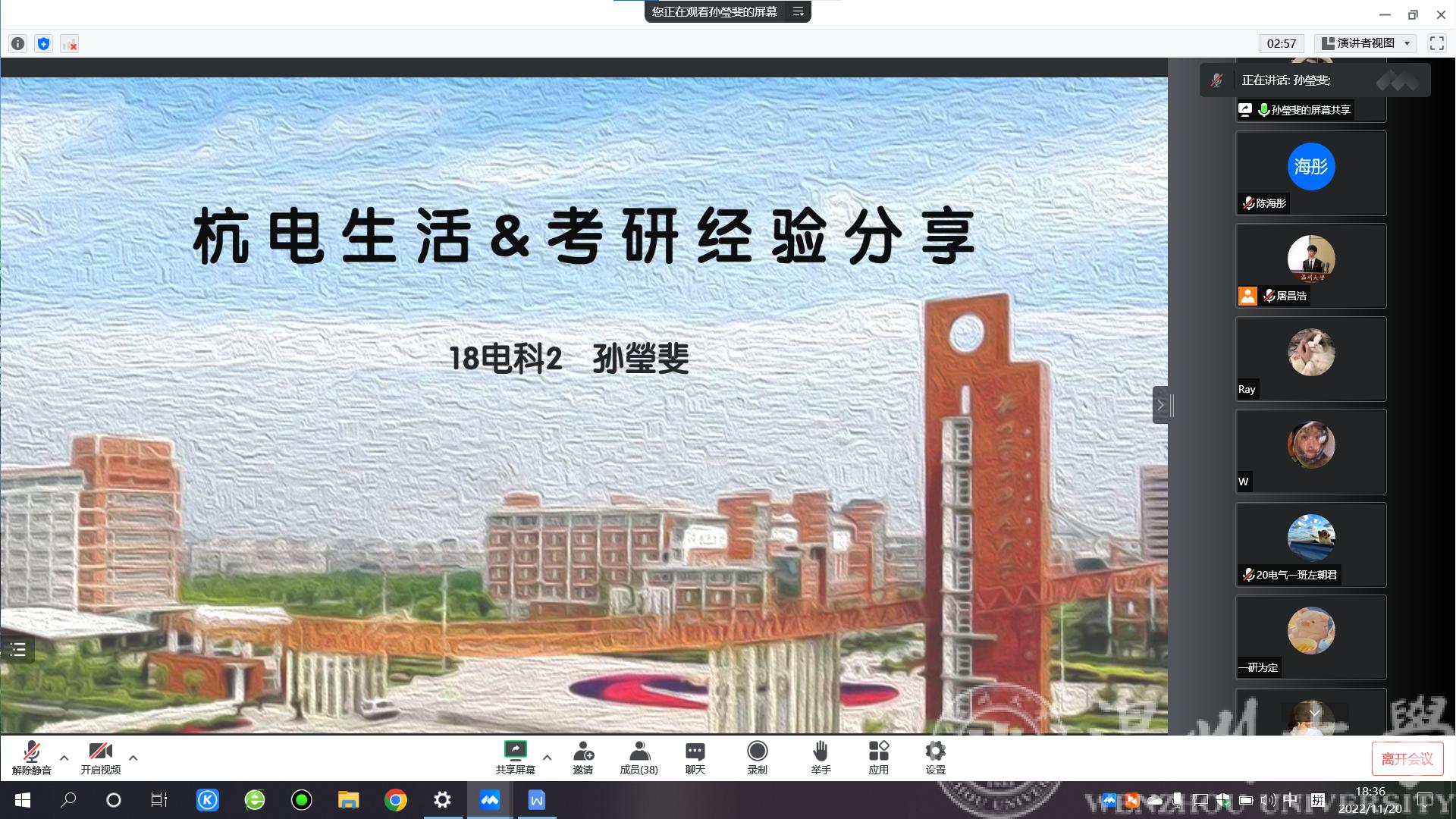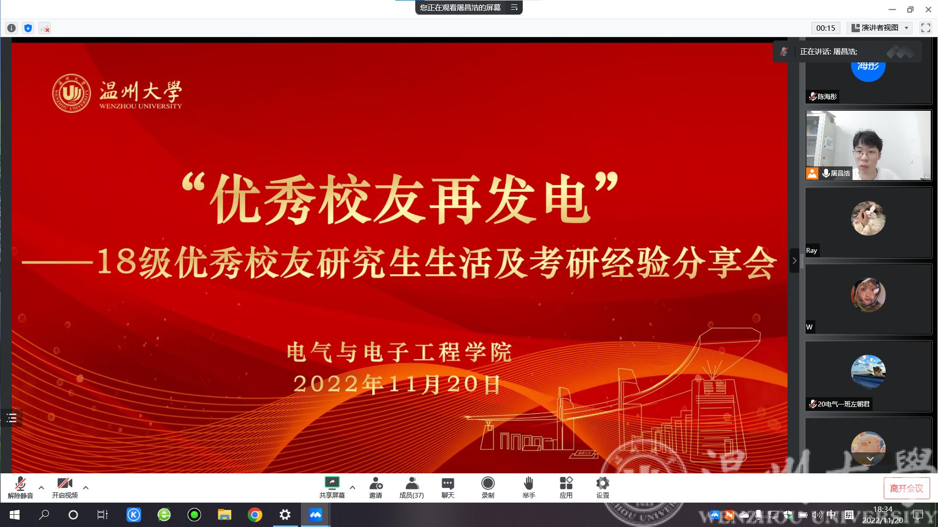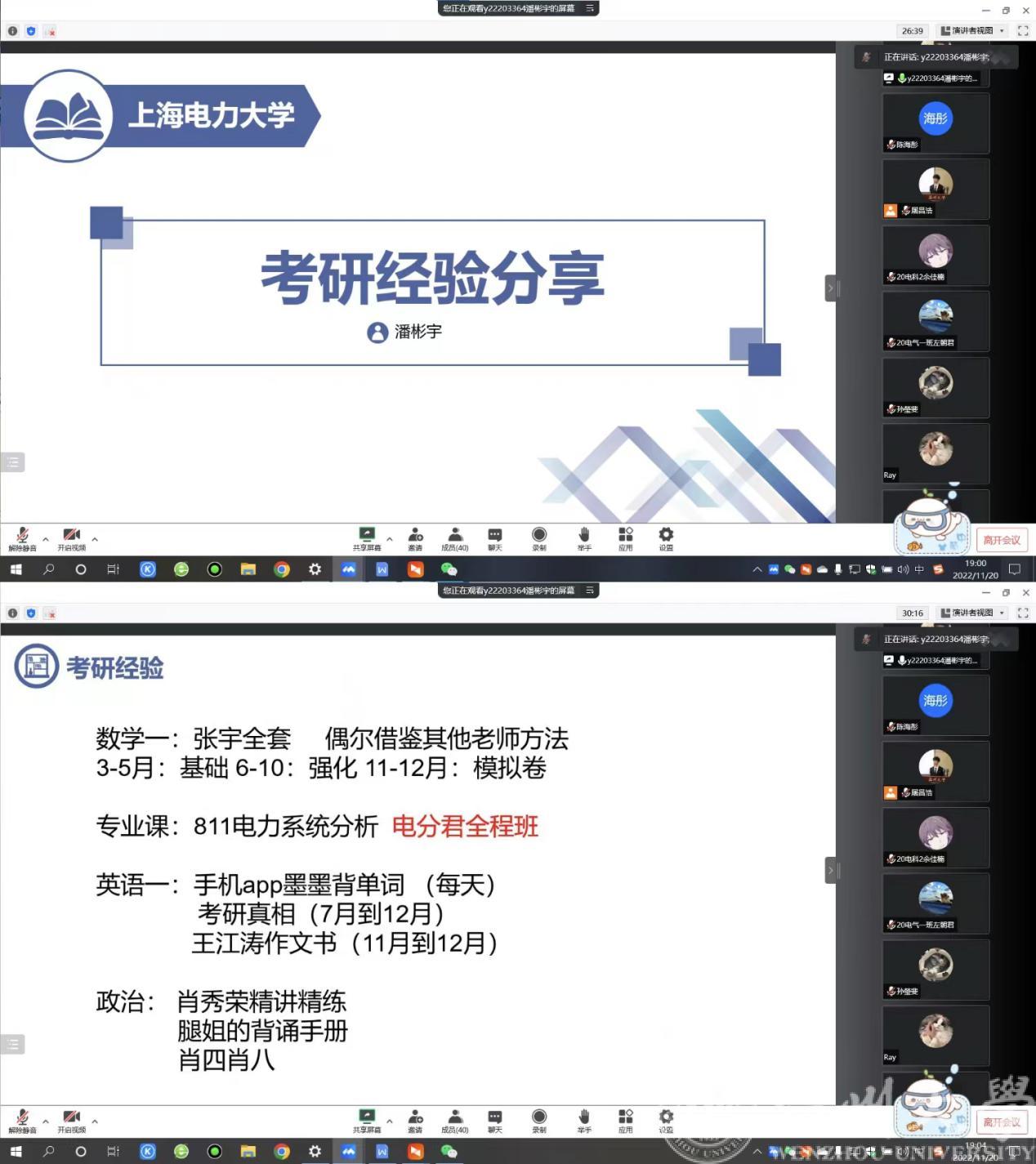 为进一步营造提高博彩平台 学生考研热情,营造良好考研氛围,同时增强校友与母校交流合作,发挥校友榜样力量。博彩平台 于11月20日晚召开组织召开线上18级优秀校友考研经验分享会。本次分享会邀请到2022届优秀毕业生孙瑩斐(目前就读于杭州电子科技大学,电子科学与技术专业)、潘彬宇(目前就读于上海电力大学,电气工程专业)为学弟学妹们们分享考研经验和研究生生活。出席本次会议的有院负责校友工作的辅导员屠昌浩老师、负责考研工作的辅导员陈海彤老师,即将参加2023年考研的学生及其他年级有意向考研同学。