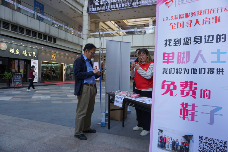据了解,该志愿服务团队凭借温州“鞋都”优势,立足于大学城,为单脚残疾人士免费赠送单脚鞋。为寻找和帮助更多需要帮扶的单脚残障人士,“单脚鞋银行”志愿服务项目团队于12月5日下午便在温州大学城商务中心开展了“聚焦残疾人士,传递公益爱心”寻找身边的单脚人士公益活动。